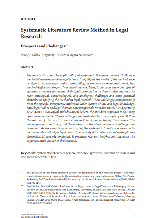 W międzynarodowym czasopiśmie „Law & Method” ukazała się publikacja zespołu badawczego kierowanego przez pracownika naszej Katedry dra Krzysztofa J. Kaletę. Artykuł „Systematic Literature Review Method in Legal Research. Prospects and Challenges” został przygotowany w ramach realizacji grantu Narodowego Centrum Nauki „Konstytucjonalizm refleksyjny jako odpowiedź na kryzys współczesnego konstytucjonalizmu”. Tekst podejmuje problematykę zastosowania w naukach prawnych systematycznej analizy piśmiennictwa (Systematic Literature Review). Metoda ta, choć szeroko rozpowszechniona w innych dyscyplinach naukowych, pozostaje wciąż słabo rozpoznana w obszarze badań nad prawem. Warto zatem poznać jej potencjalne możliwości i ograniczenia. O wszystkim dowiedzą się Państwo z tekstu. Zachęcamy do lektury!